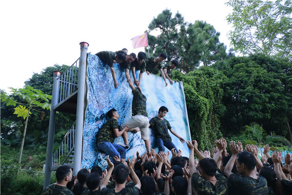 经过一上午的团队拓展活动,大家已经彻底融入了这个团队中,中午大家的午餐安排的是我们松湖生态园的特色农家乐围餐,八菜一汤,10人一桌,荤素搭配,营养有美味的特色农家餐为大家补充上午消耗的体力和能量,吃饱喝好后的大家在园区内休息半个小时就进行下午的团队拓展活动,下午的团队拓展项目有:舞动青春、毕业墙。在炫动的音乐下,大家随着教练舞动着青春,舞动着奇迹,舞动着生命。记下来就是我们团队拓展的关键项目:毕业墙。一堵4.2米的高墙,光滑、没有任何工具,要求所有的队员都翻越过去,才算胜利。在这个项目中,我不想说我学到了团结的力量是无穷的,也不想说集体的能力是伟大的,更不想说人的潜能是无限的……这个游戏给于我的,除了感动,还是感动。为第一个爬上墙头,坚持救上个一个又一个同伴的朋友感动!为在下面咬着牙甘当基石,让一个个同伴们踏着自己的肩头求生的朋友感动!为指挥大家伙儿逃生,用自己的双手将同伴们一个一个高高举起的朋友感动!直到墙下只剩下了一个同伴,再没有人给他当基石供他向上攀爬的时候,于是,一个体重较轻的队友从墙头上垂了下来,墙下的队友坚定的抓住了墙上同伴的手。当最后一人成功跃上墙头的时候,响起了经久不息的掌声。这就是团队的力量。